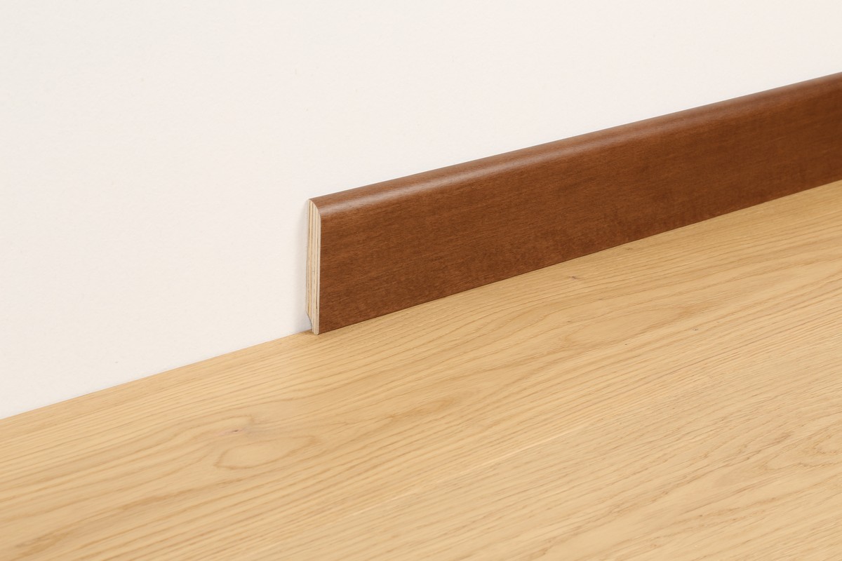Battiscopa in multistrato rivestito in legno di Tanganica, ideale per completare pareti e pavimenti con calore, eleganza e durata.